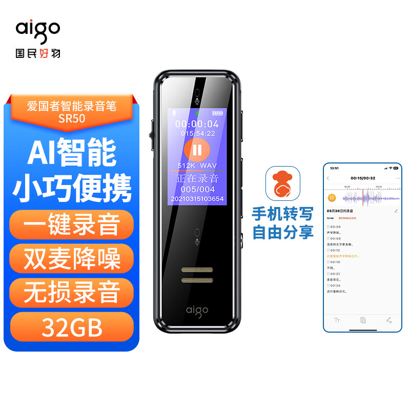 爱国者aigo 32G AI智能录音笔SR50 专业高清降噪 会议录音转文字 录音器 同声传译 黑色价格:369.00元!