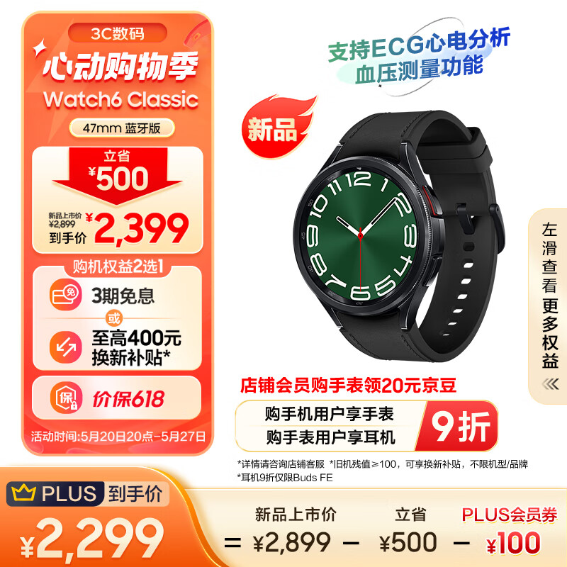 三星Galaxy Watch6 Classic 蓝牙通话/智能手表/运动电话手表/ECG心电分析/血压手表 47mm 宇夜黑价格:2399.00元!