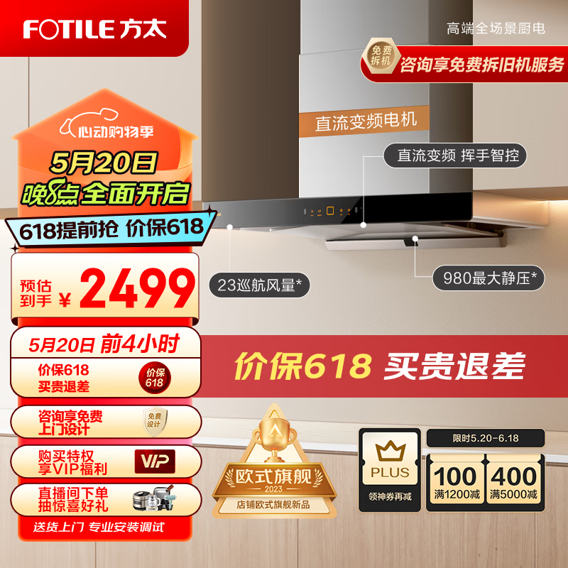 方太(FOTILE)欧式顶吸抽吸油烟机 家用厨房 23m3/min超大吸力 挥手智控 直流变频 单烟机02-EMD22T价格:2699.00元!