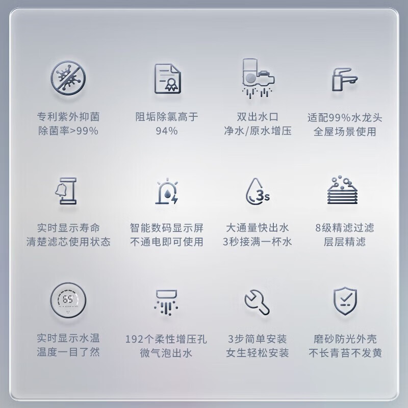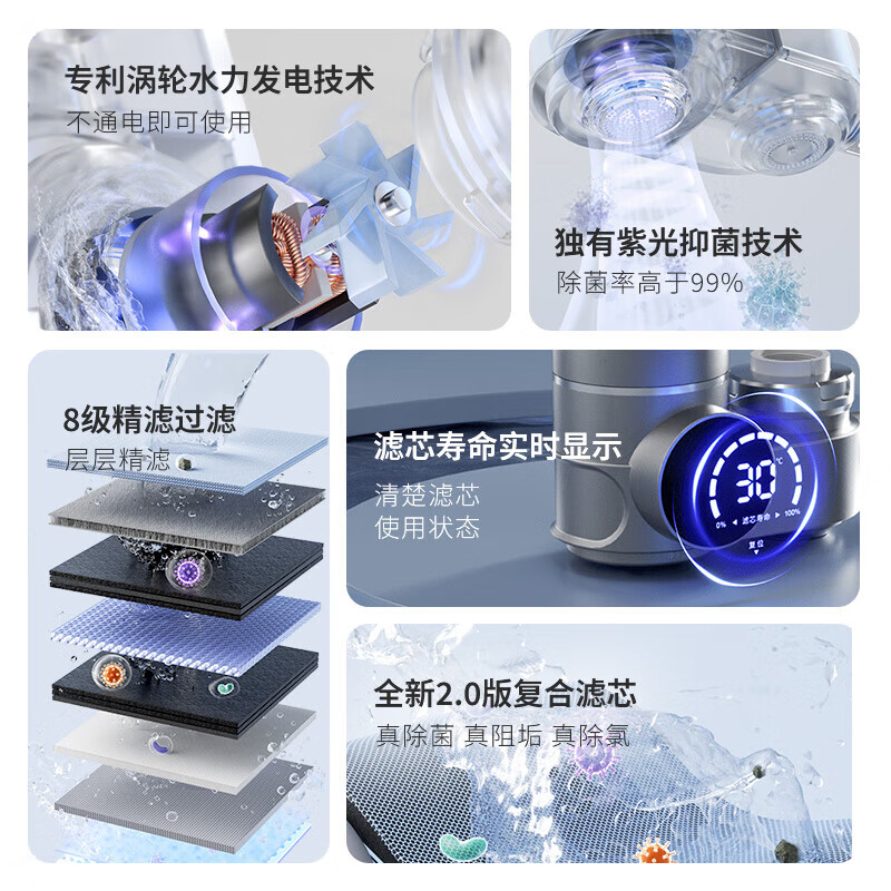 小质 水龙头净水器除水垢除余氯家用过滤水垢台式前置过滤器家用厨房自来水8级过滤UV紫外 LJ206【一机五芯】【15%客户选择】 数码显示+水力发电+紫外除菌+精滤价格:238.00元!