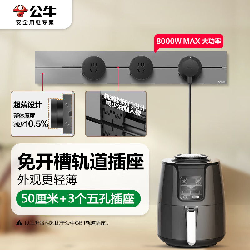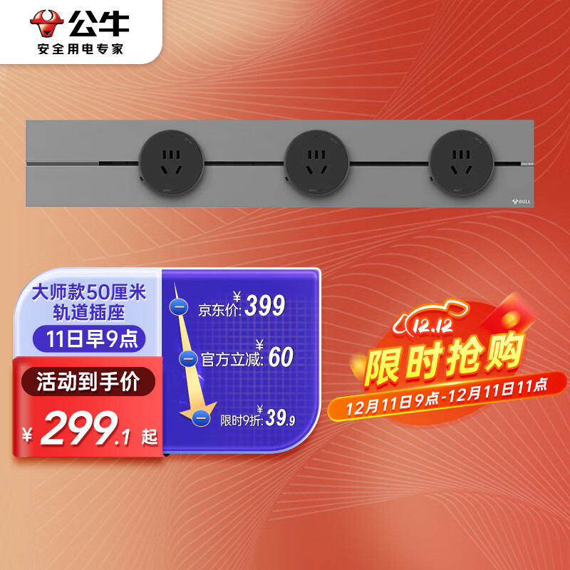 公牛(BULL)明装 轨道插座 大师轻薄款可移动墙壁插座壁挂式滑轨插座 免打孔 50厘米轨道+3个五孔 钛金灰价格:399.00元!