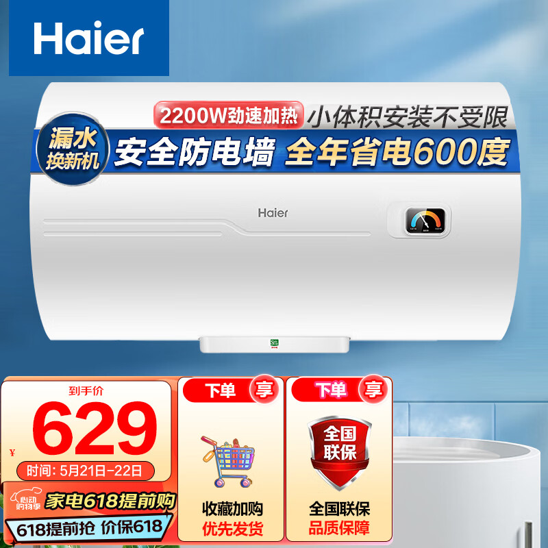 海尔(Haier)60升【安心浴】电热水器2200W高效加热 小尺寸节能金刚三层胆安防不漏水 专利防电墙 EC6001-HC3新价格:629.00元!