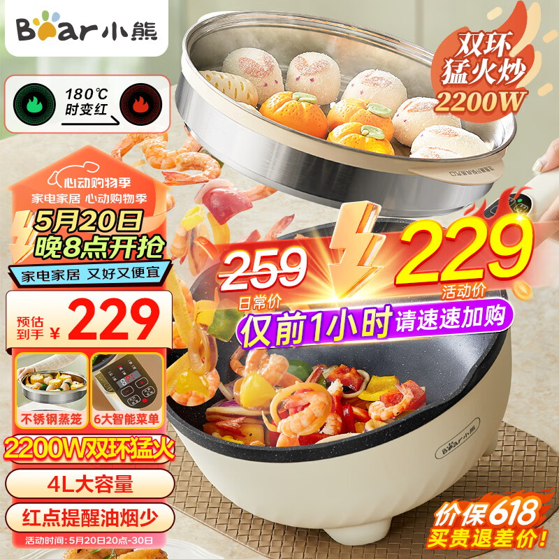 小熊(Bear)电炒锅 家用炒菜专用锅 电煮锅电蒸锅电火锅煎炒蒸煮不沾一体多功能大功率爆炒 DCG-A28M2 配蒸笼价格:229.00元!