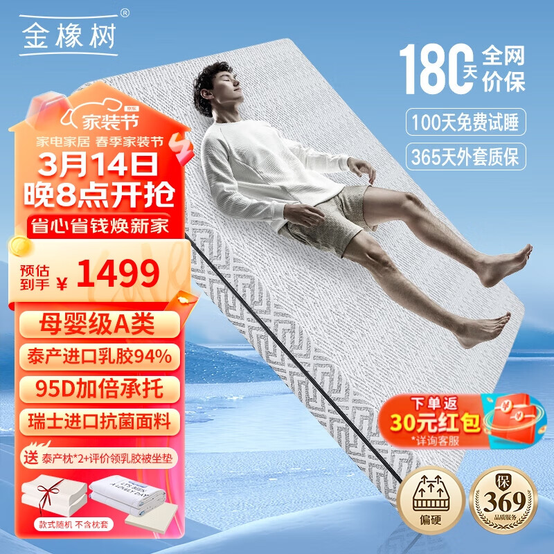 金橡树尊享95D加硬轻奢泰国整芯原产进口乳胶床垫1.8米*2米 94%世爵PLUS价格:1499.00元!
