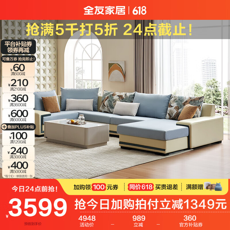 全友家居 家用布艺沙发现代简约大户型贵妃沙发家具客厅实木架102085价格:4948.75元!