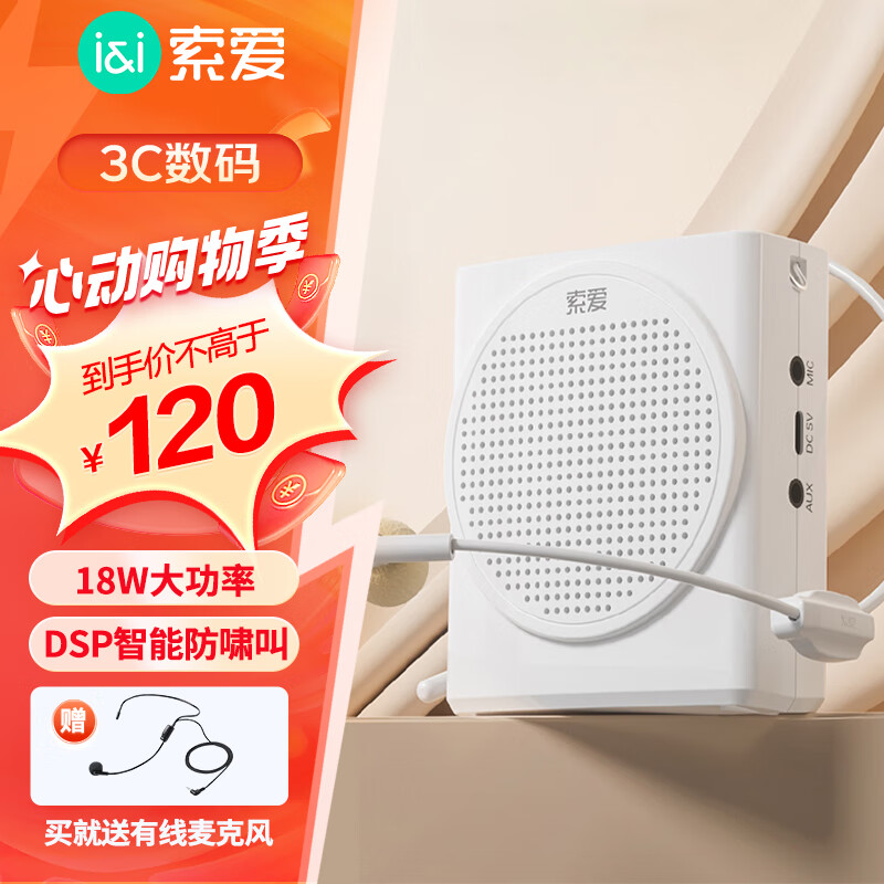索爱(soaiy)S638小蜜蜂扩音器教师专用18W功率智能防啸叫300S一键录音蓝牙音箱喇叭教学导游导购喊话Type-c白价格:139.00元!