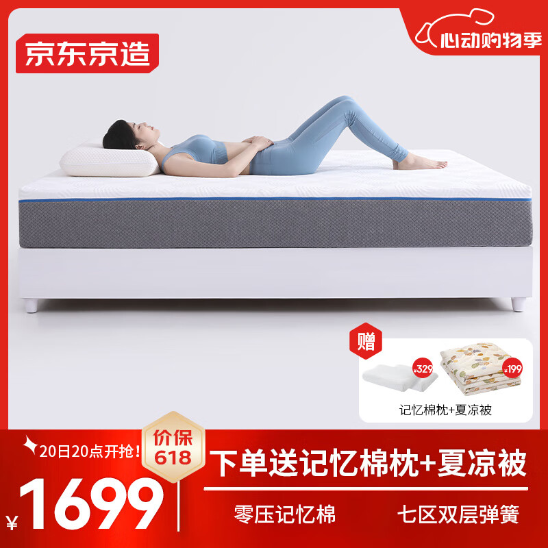 京东京造弹簧床垫 0压记忆棉|双层弹簧|软硬两用 席梦思床垫1.8×2米MS01价格:1899.00元!
