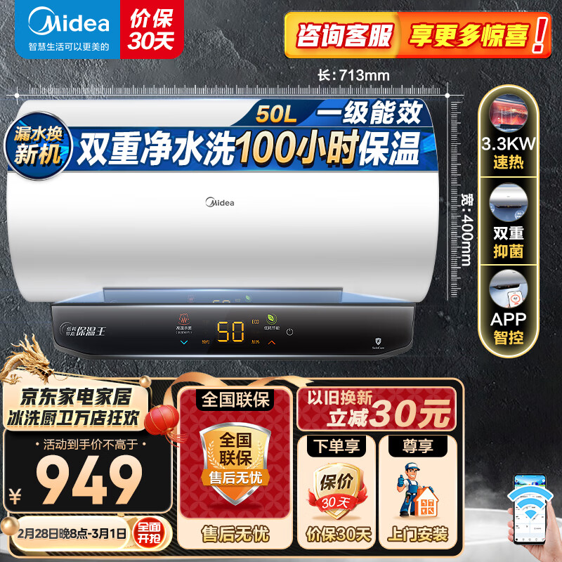 美的(Midea)50升储水式家用电热水器 升级2500W速热 一级节能省电健康防漏电 F5022-M5(HE)价格:949.00元!