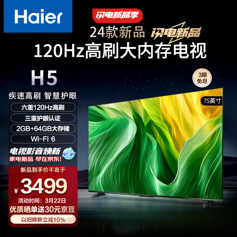 海尔75H5 75英寸电视4K超高清120Hz屏2+64GB大内存护眼电视智能液晶平板电视机以旧换新价格:3499.00元!