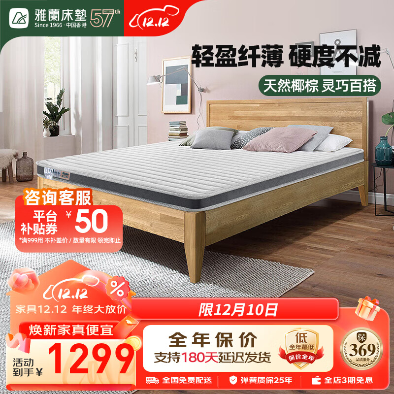 雅兰椰棕床垫偏硬舒脊学生薄床垫宿舍床垫 硬核椰棕款【5cm】1.8*2m价格:1599.00元!