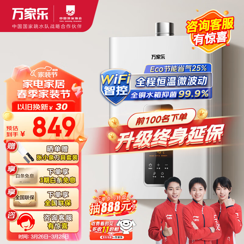 万家乐13升燃气热水器天然气智能变升节能一键智能恒温微波动厨房洗防冻 JSQ26-13DP1(F)以旧换新价格:849.00元!