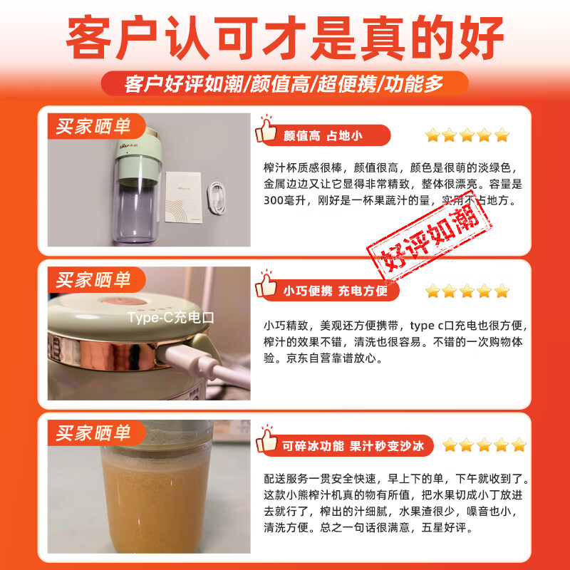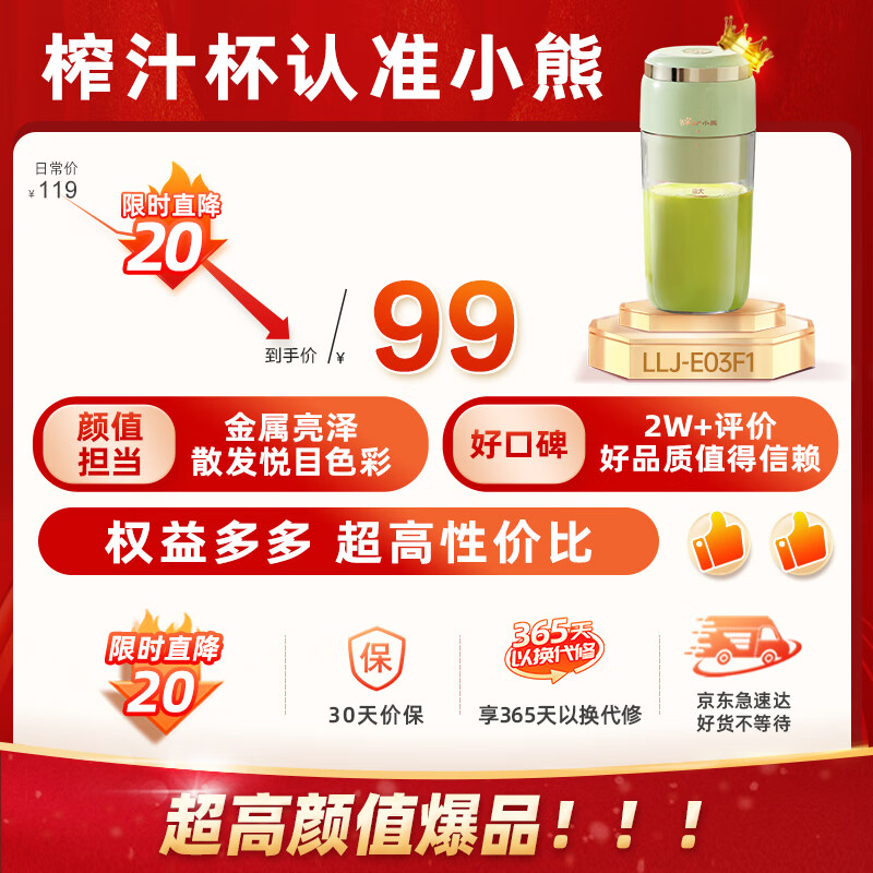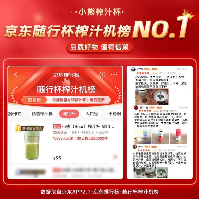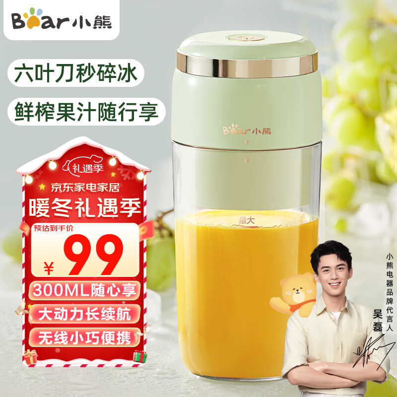 小熊(Bear)榨汁杯 家用便携式榨汁机 水果果蔬果汁机 秒碎冰打汁机 充电迷你小型果汁杯 LLJ-E03F1价格:99.00元!
