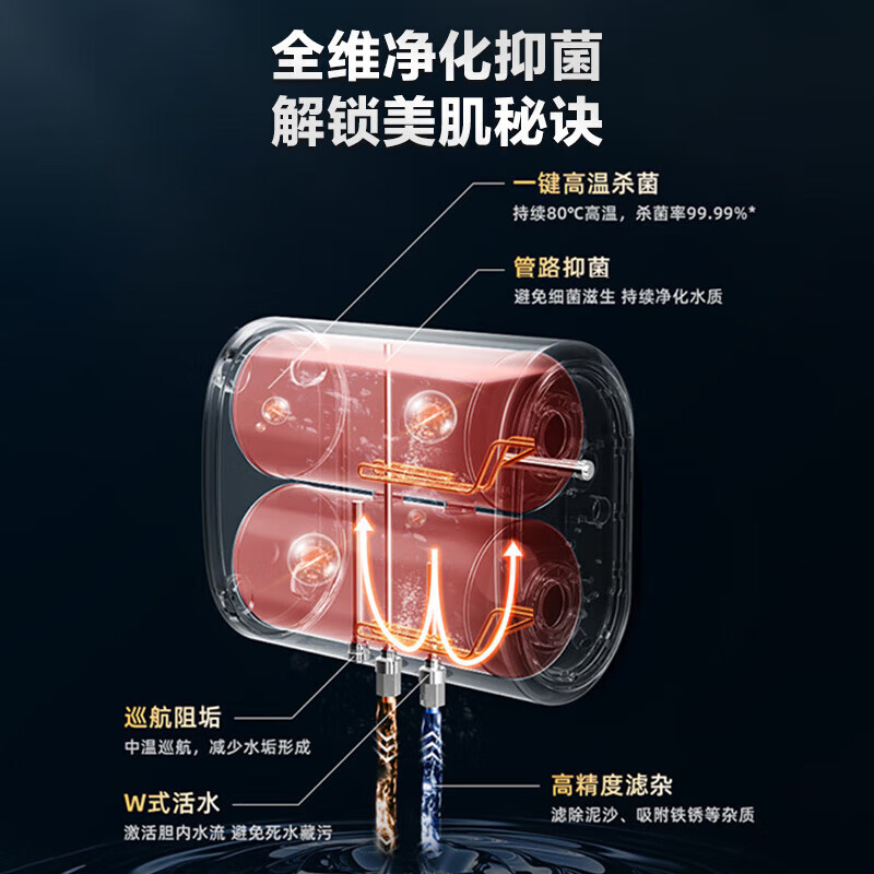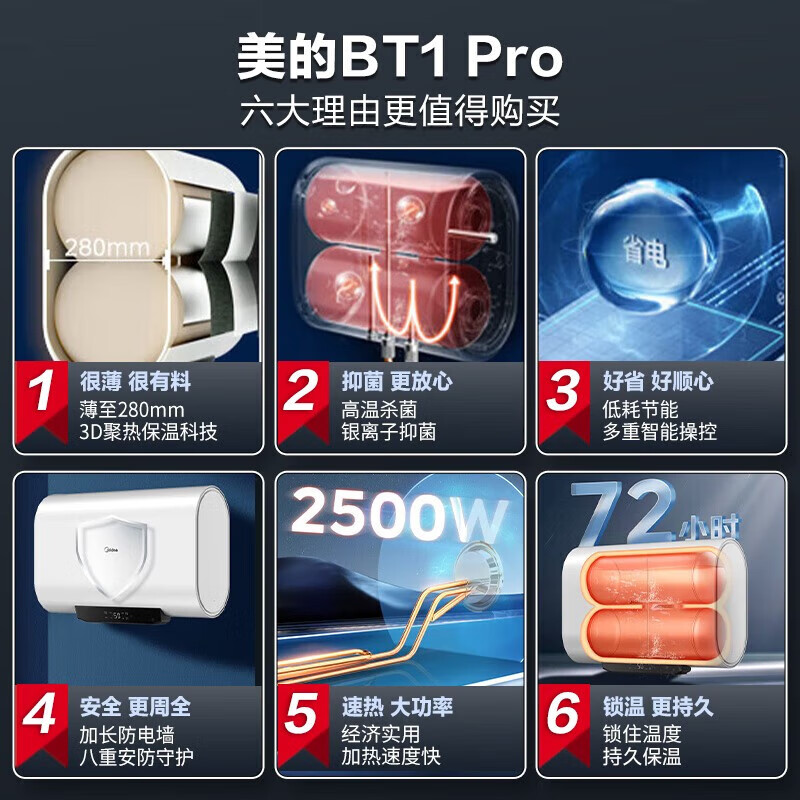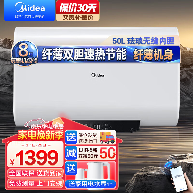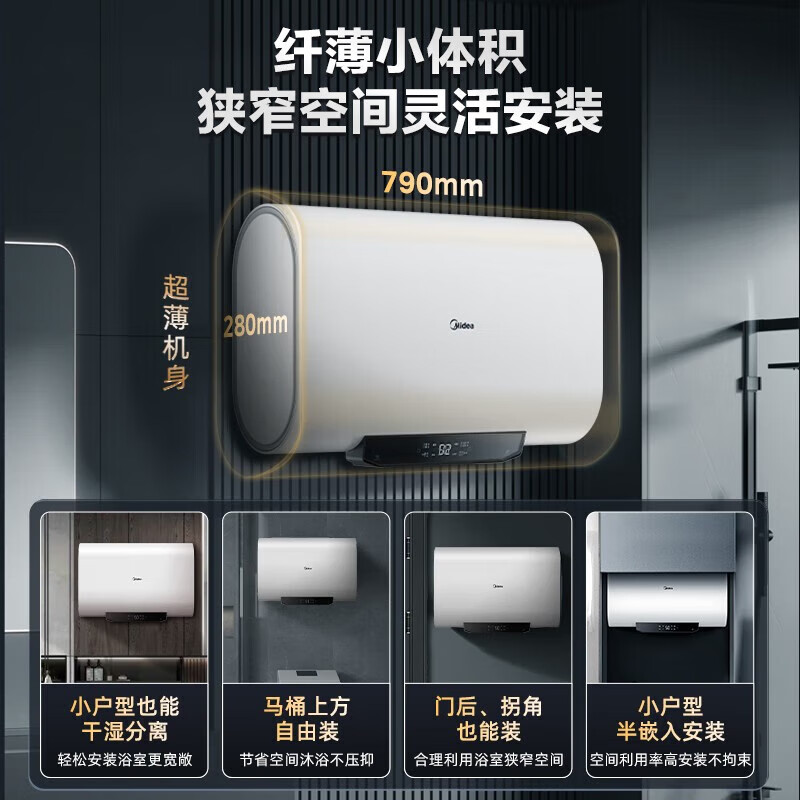 美的(Midea)50升储水式电热水器玲珑扁桶超薄机身2500W速热节省空间节能双胆速热以旧换新F5025-BT1pro(H)价格:1399.00元!