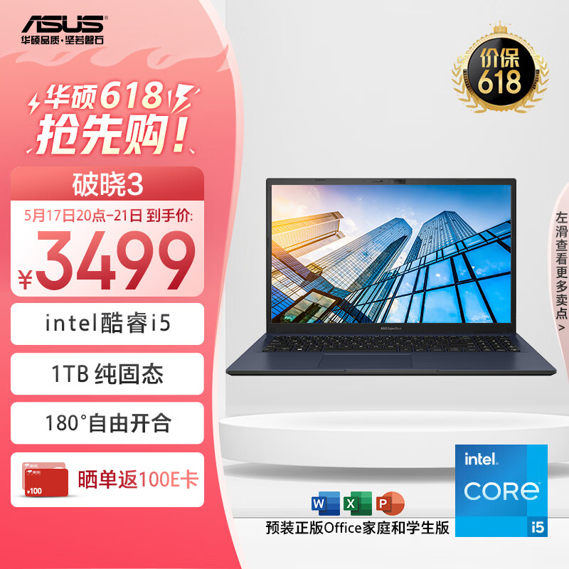 华硕破晓3 15.6英寸轻薄商务商用办公指纹人脸双识别笔记本电脑(13代酷睿i5 16G 1TB SSD大固态)价格:3499.00元!