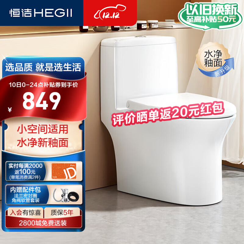恒洁(HEGII)马桶171 家用节水防臭水净釉面虹吸式坐便器HC0171PT0E-305价格:1049.00元!