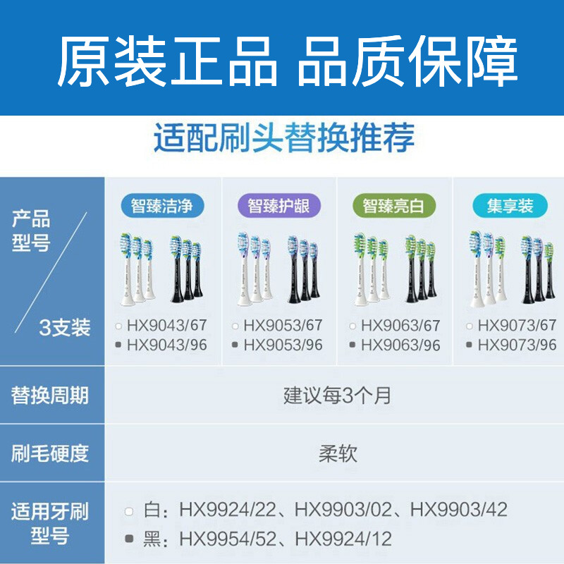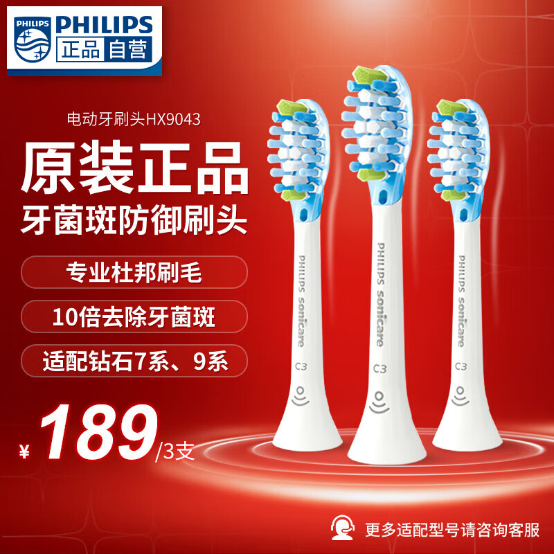 飞利浦(PHILIPS) 电动牙刷头替换头钻石系列适配HX9924HX9903HX9911HX9912HX9954HX9924 白色洁净型装HX9043/67 3支价格:209.00元!