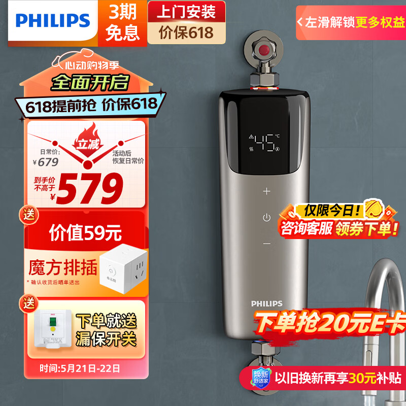 飞利浦(PHILIPS)即热式小厨宝电热水器 不限水量5500W变频即开即热免储水 厨房热水宝小尺寸水电分离AWH1065/93价格:679.00元!
