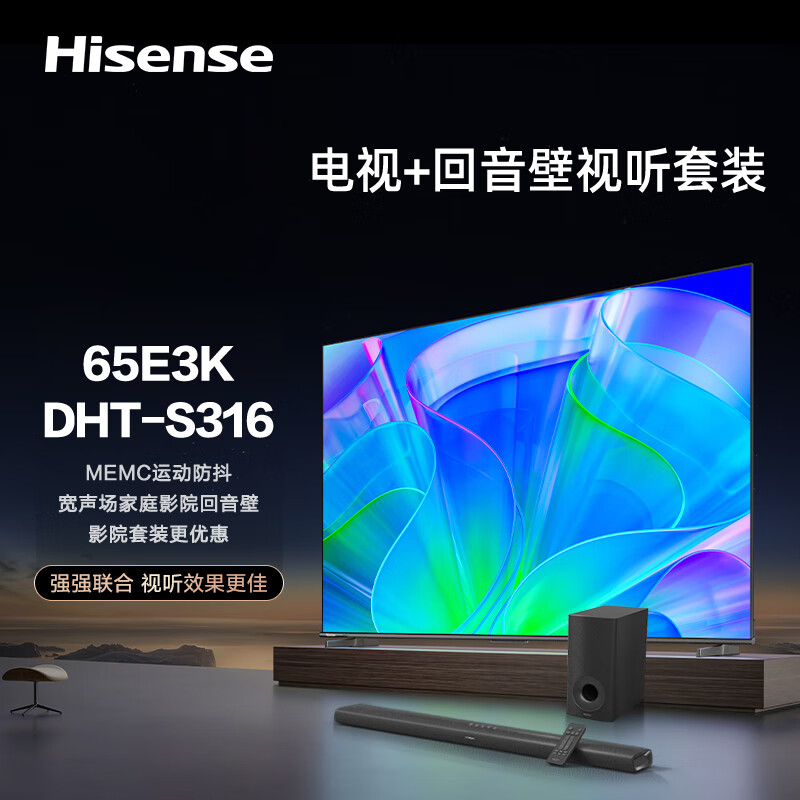 海信电视65E3K+DHT-S316沉浸追剧套装 65英寸 MEMC防抖 2GB+32GB U画质引擎 4K高清智慧屏平板电视机价格:3188.00元!