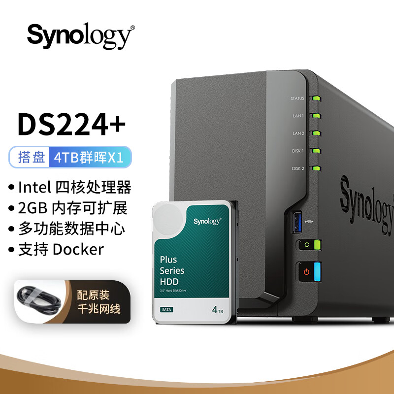 群晖(Synology)DS224+ NAS配1块4TB群晖HAT3300硬盘套装 数据备份一体机价格:3272.00元!