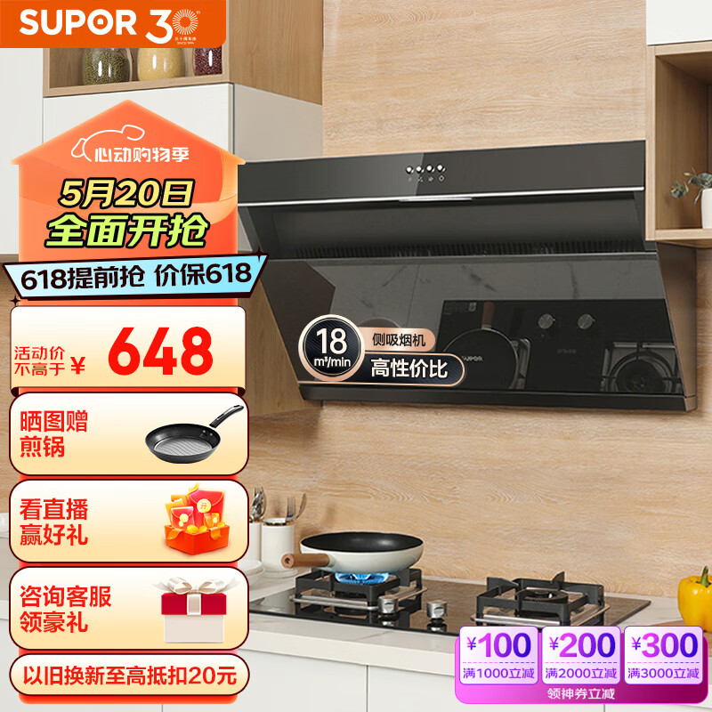 苏泊尔(SUPOR) 抽油烟机 家用小尺寸大吸力 18立方侧吸式吸油机小户型老式厨房脱排油烟机 DJ13价格:648.00元!