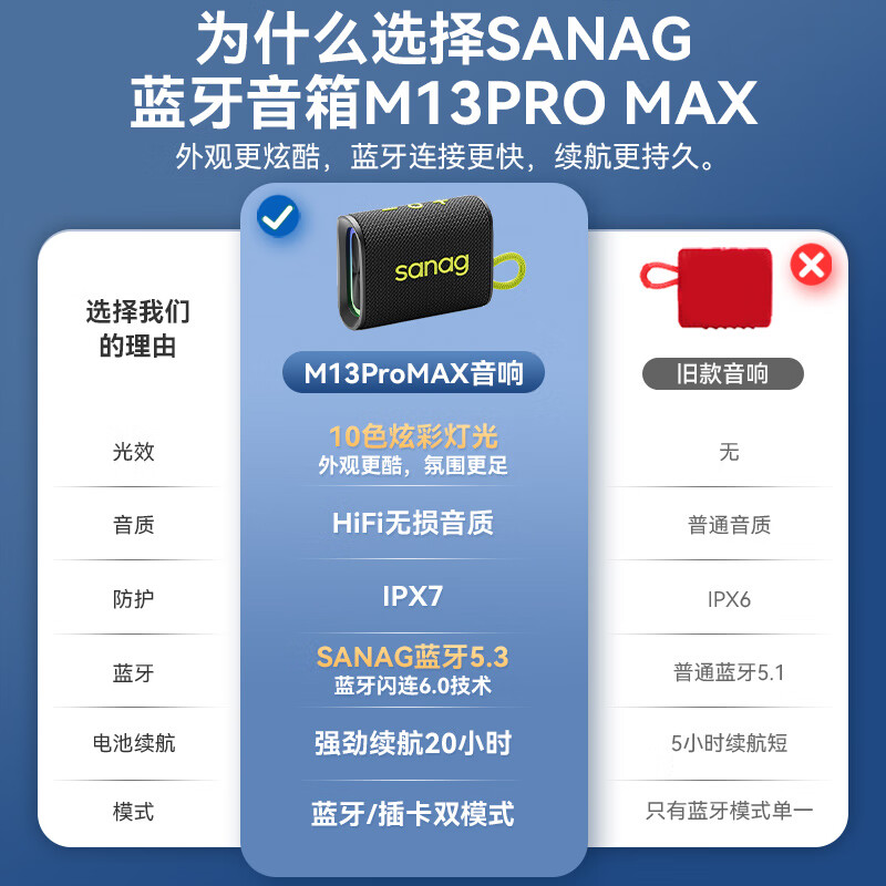 SANAG塞那 蓝牙音箱便携式 户外音响 低音炮桌面微信收款扩音器 户外露营骑行防水设计 M13SProMax 红价格:319.00元!