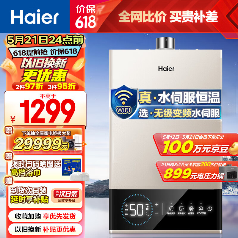海尔(Haier)16升燃气热水器天然气无级变频水伺服恒温智护自洁家用智慧节能JSQ30-16JM6(12T)U1 京东小家智能价格:1399.00元!