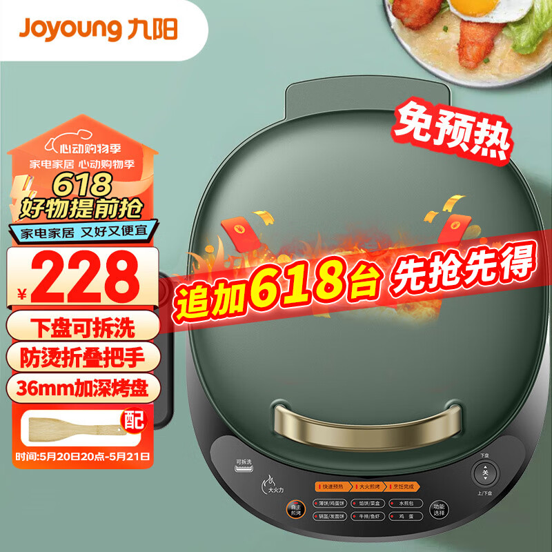 九阳(Joyoung)家用电饼铛 双面加热深烤盘1700W大火力煎烤机烙饼机 下盘可拆易清洗早餐机JK30-GK550价格:228.00元!