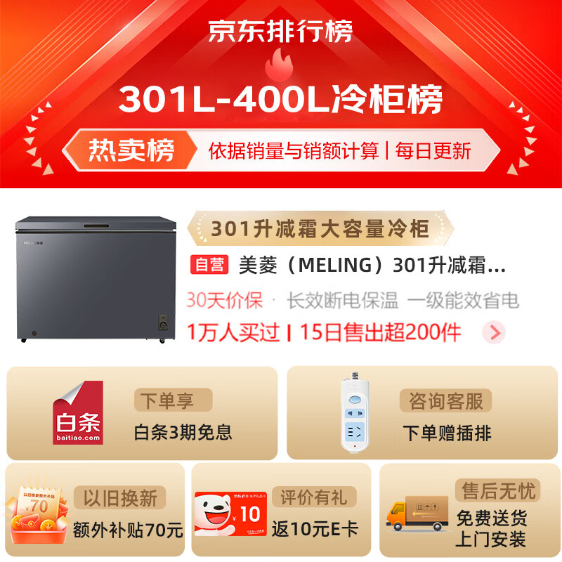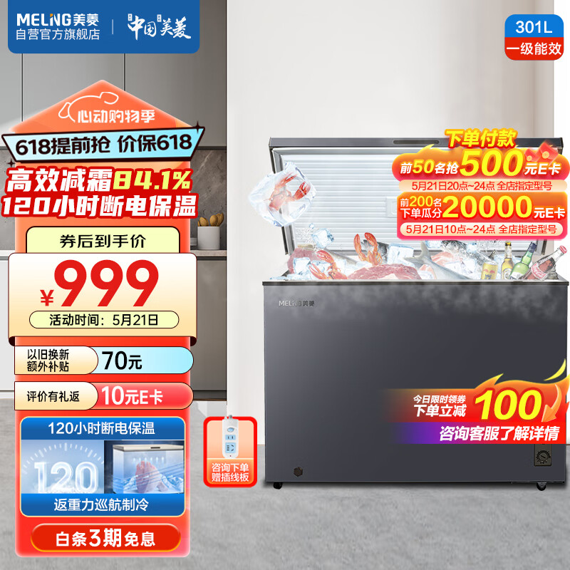 美菱(MeiLing)301升低霜大容量家用商用冰柜冷藏冷冻转换冷柜雪糕冰柜一级能效卧式冰箱BC/BD-301DT灰以旧换新价格:1099.00元!