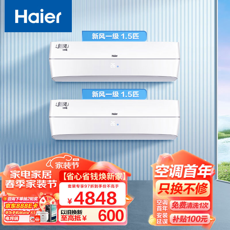 海尔(Haier)新风 新一级能效 变频 冷暖挂机 1.5匹+1.5匹空调套装 KFR-35GW/B4AFA81U1(白) 以旧换新价格:4848.00元!