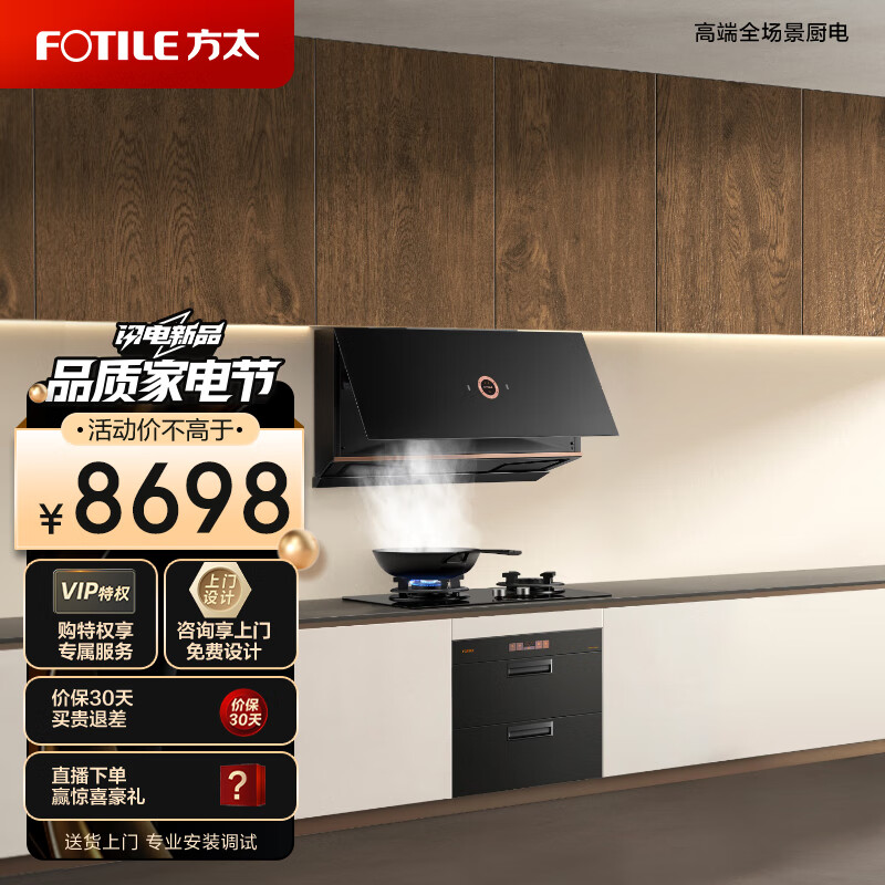 方太(FOTILE)厨房侧吸烟灶消三件套 25大风量变频烟机 5kW联动烟灶 100升智控嵌入式消毒柜P1A.i+THF1A+JF1E.I价格:8698.00元!