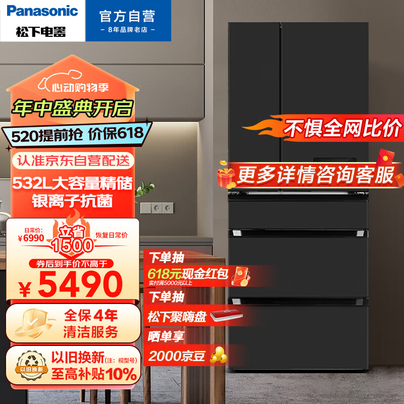 松下(Panasonic)532升家用大容量多门冰箱 不串味 变频无霜风冷NR-EE53WGB-K炫墨黑高端款价格:6490.00元!