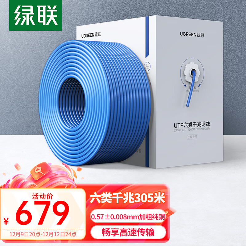 绿联(UGREEN)六类千兆网线【0.57±0.008mm纯铜线芯】CAT6类非屏蔽双绞线 POE供电监控工程家装箱线 305米价格:679.00元!