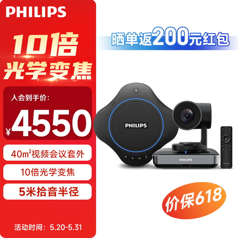 飞利浦视频会议套装/适用40㎡解决方案/5米拾音半径全向麦克风0500+10倍变焦2K高清视频会议摄像头0600价格:4550.00元!