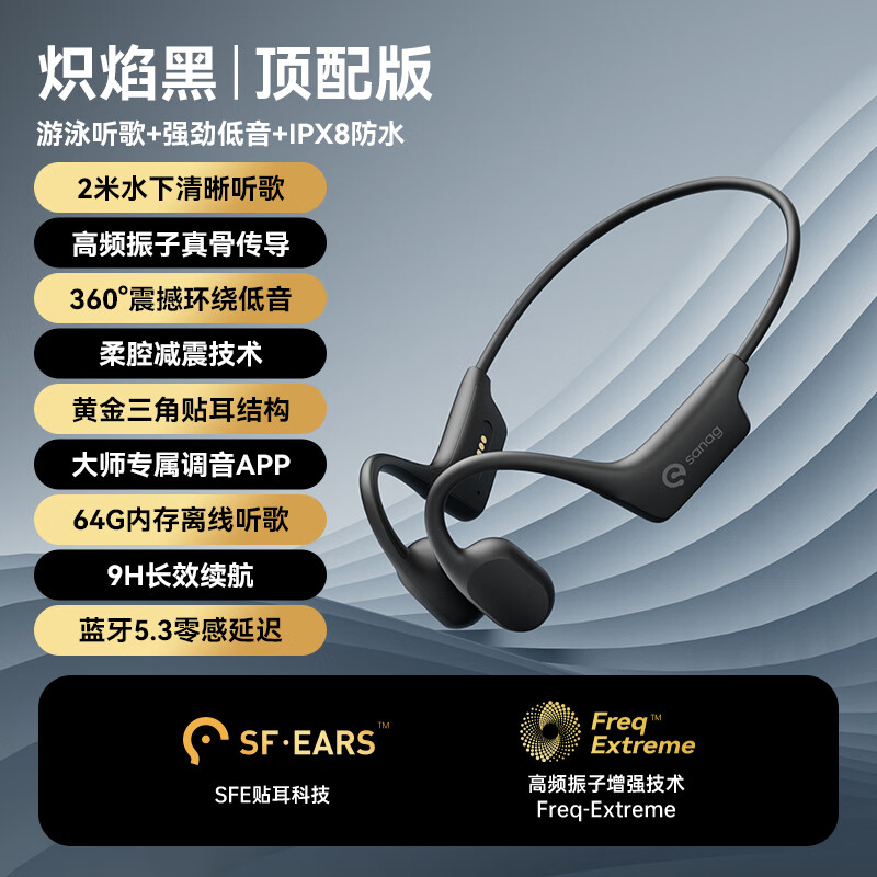 SANAG【运动金榜】蓝牙耳机骨传导概念不入耳挂耳式专业运动骑行跑步长续航通话降噪防水带内存适用苹果 灼岩黑|IPX8|64G|真骨传导 蓝牙5.3丨IPX7防水丨9H续航价格:329.00元!