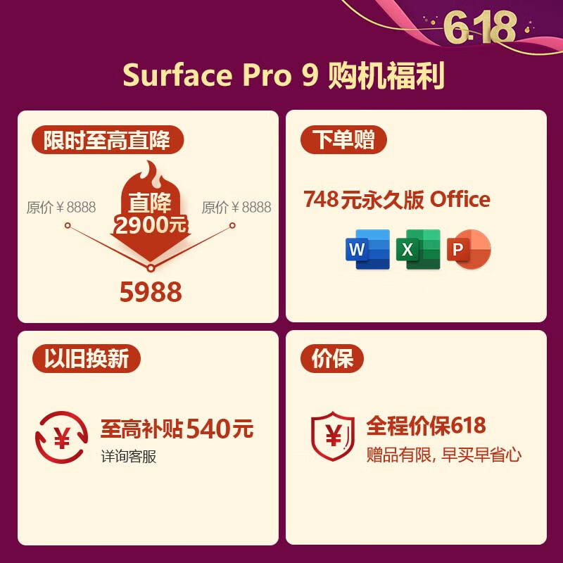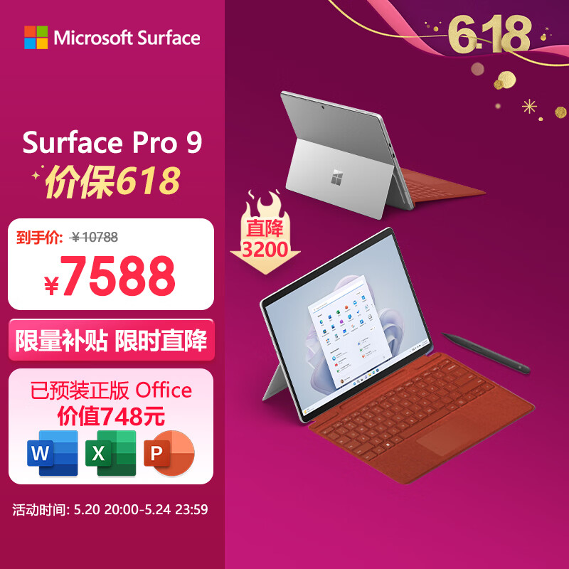 微软Surface Pro 9 亮铂金+波比红带触控笔键盘盖 i5 8G+256G 二合一学生电脑 13英寸120Hz 平板笔记本价格:7588.00元!