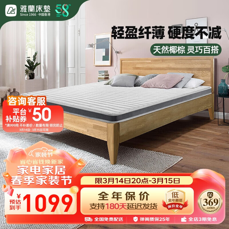 雅兰椰棕床垫偏硬舒脊学生薄床垫宿舍床垫 硬核椰棕款【5cm】1.35*2m价格:1399.00元!