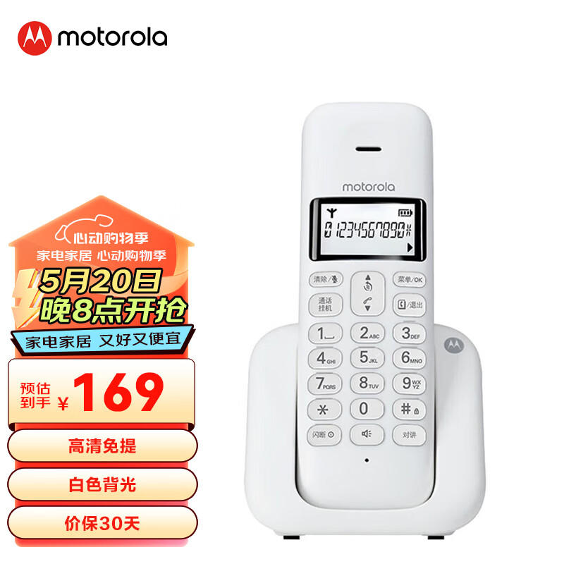 摩托罗拉(Motorola)数字无绳电话机 无线座机 子母机 单机办公家用 大屏幕白色背光 清晰免提 持久续航 T301C(白色)价格:169.00元!