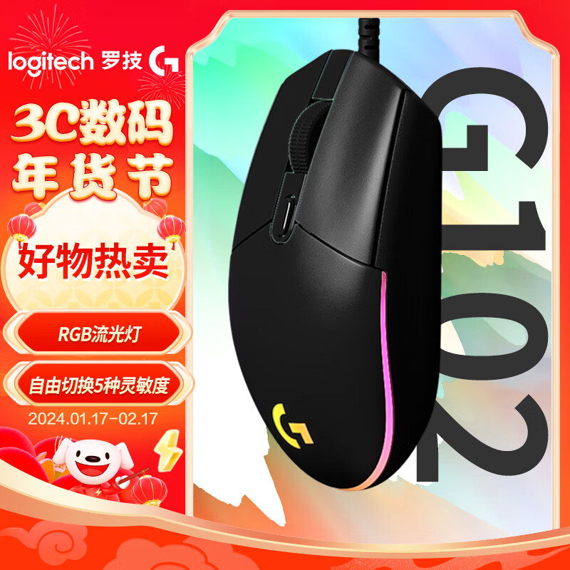 罗技(G)G102第二代游戏鼠标 RGB流光灯效鼠标 轻量化设计 吃鸡鼠标 游戏级8000DPI传感器 黑色价格:99.00元!