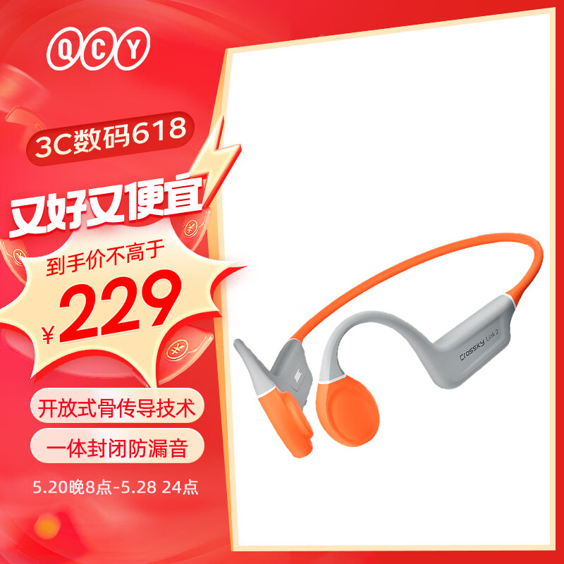 QCYCrossky link2真骨传导无线蓝牙耳机挂耳式运动开放性不入耳通话降噪适用于全手机 橙色价格:229.00元!