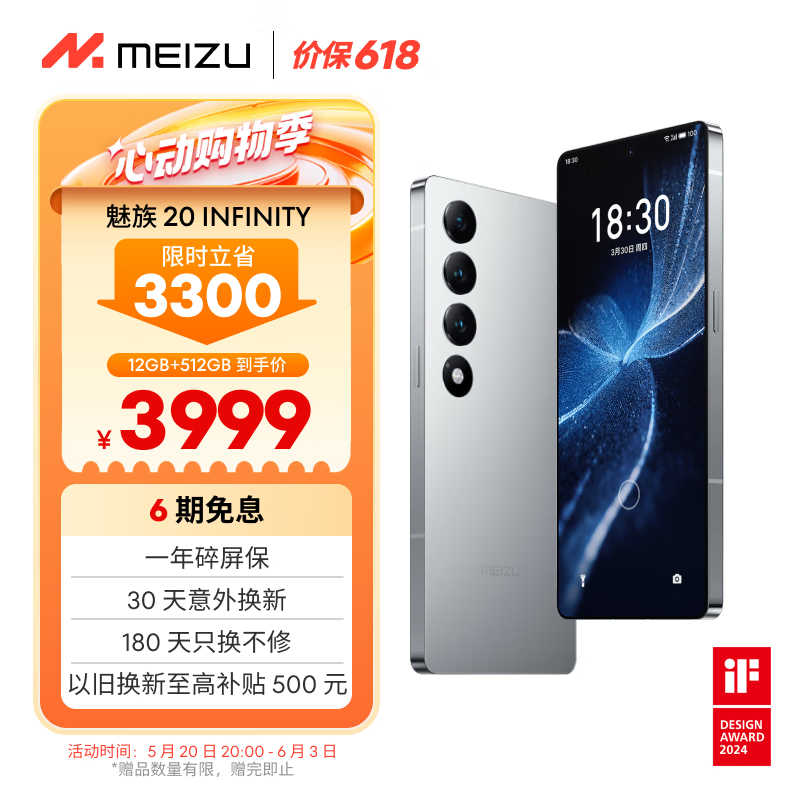 魅族(MEIZU)20 INFINITY无界版 骁龙8Gen2 Flyme系统 2K+臻彩屏 5G游戏学生拍照 领克手机域 太空银 12+512GB价格:3999.00元!