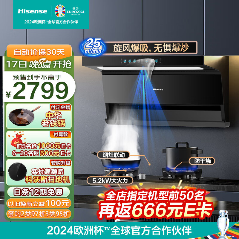 海信(Hisense)抽油烟机 顶侧双吸烟灶套装25立方挥手免拆洗烟灶联动5.2kW防干烧燃气灶具套装DS11H(Plus)+A1价格:2799.00元!