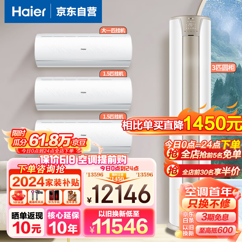 海尔(Haier)三室一厅空调套装 新一级能效变频冷暖空调 大1匹+1.5匹*2+3匹空调 WiFi智控 光感睡眠 以旧换新价格:12146.00元!