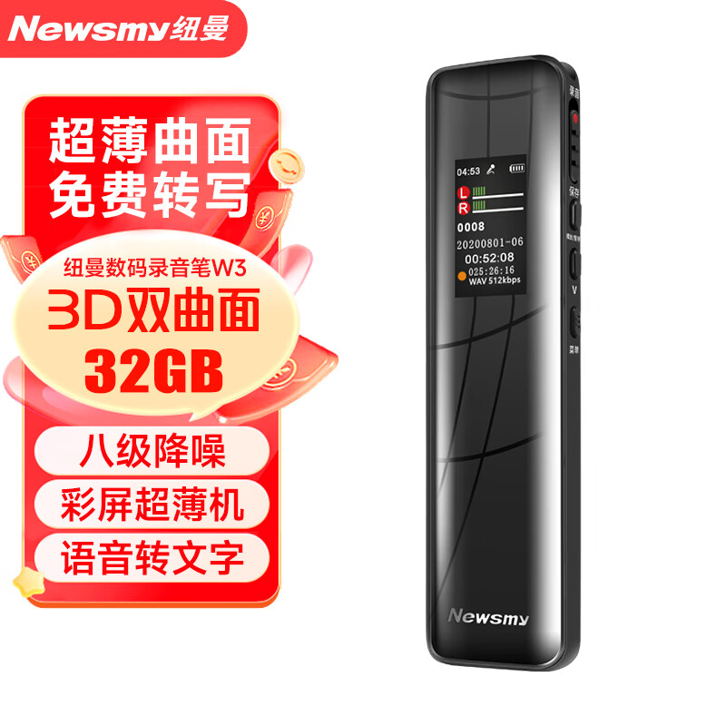 纽曼录音笔 W3 32G 会议录音转文字 专业高清远距降噪 培训交流商务会议速记 彩屏Type-C 录音器 黑色价格:199.00元!
