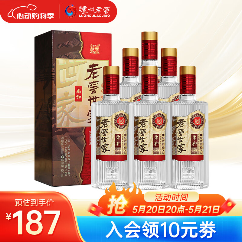 泸州老窖 老窖世家柔和浓香型白酒 52度 500ml*6瓶整箱纯粮酒(含礼袋)价格:187.00元!