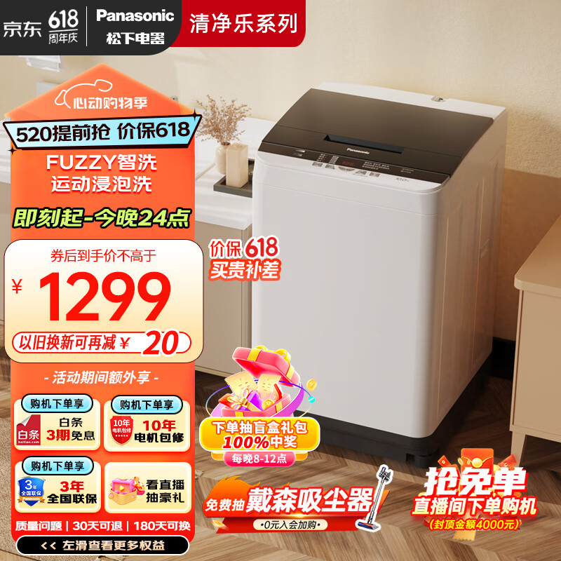 松下(Panasonic)波轮洗衣机全自动 清净乐系列10公斤大容量 线屑过滤 桶自洁免清洗耐脏 以旧换新XQB100-8Q1A价格:1499.00元!