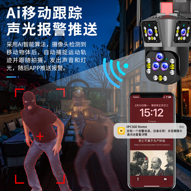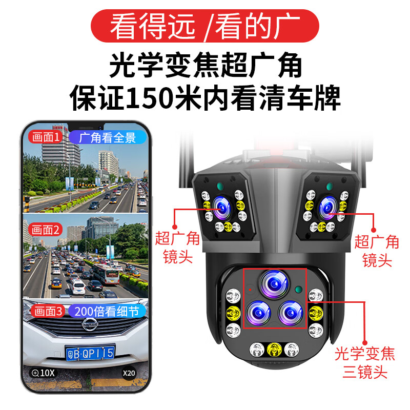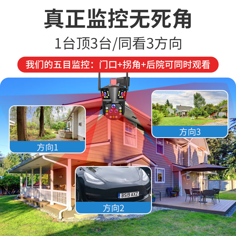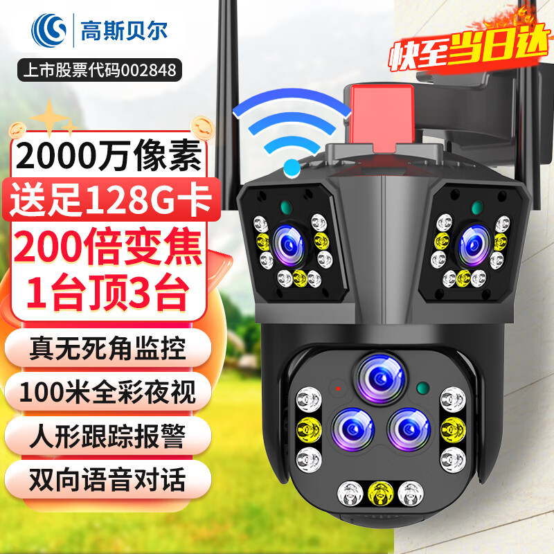 高斯贝尔摄像头监控器室外360度无死角带夜视全景4K高清家用手机远程变焦防水户外4g无线WiFi旋转 5目版+激光夜视+200倍变焦+足128G价格:529.00元!