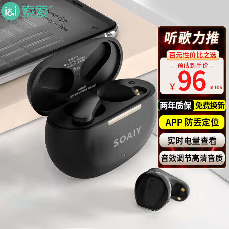 索爱(soaiy)蓝牙耳机半入耳式无线定位防丢高品质通话降噪低音商务轻巧长待机高续航 SL6旗舰版 典雅黑价格:106.00元!