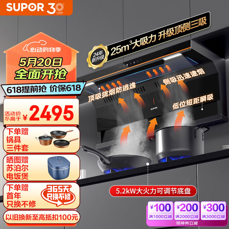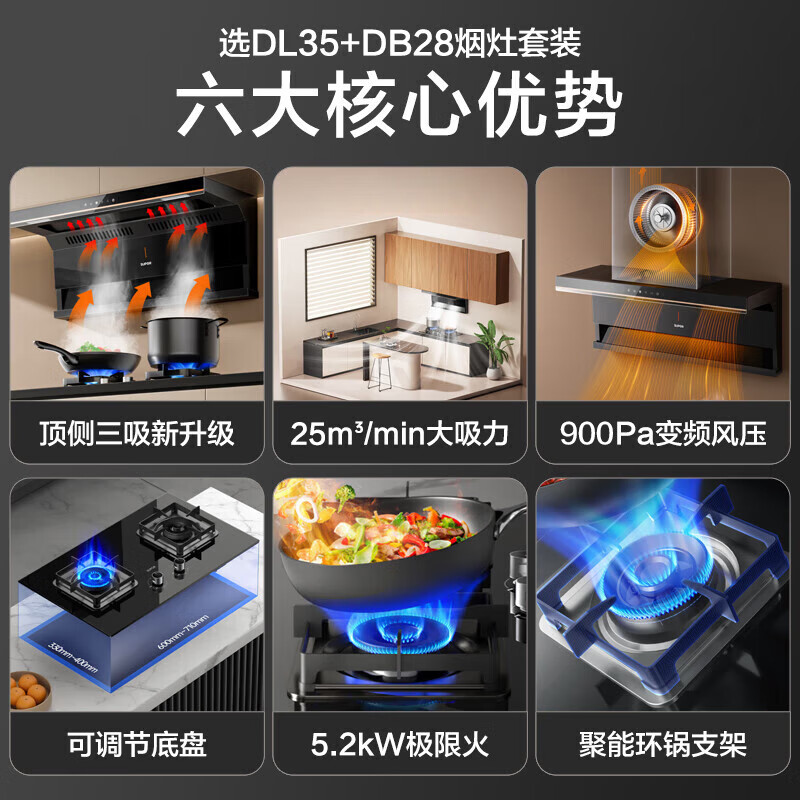 苏泊尔(SUPOR)抽油烟机 顶侧双吸油烟机灶具套装 25立方变频 5.2KW可调节烟灶 家用油烟机燃气灶 DL35+DB28液价格:2495.00元!