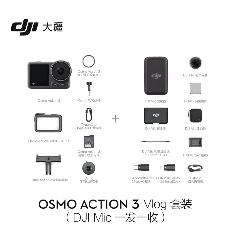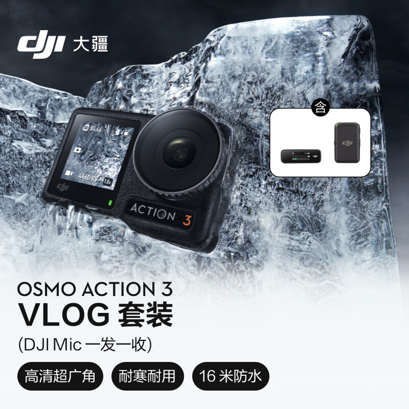 大疆 DJI Osmo Action 3 Vlog套装(DJI Mic 一拖一)高清防抖Vlog运动相机+随心换2年版+128G内存卡价格:2976.90元!