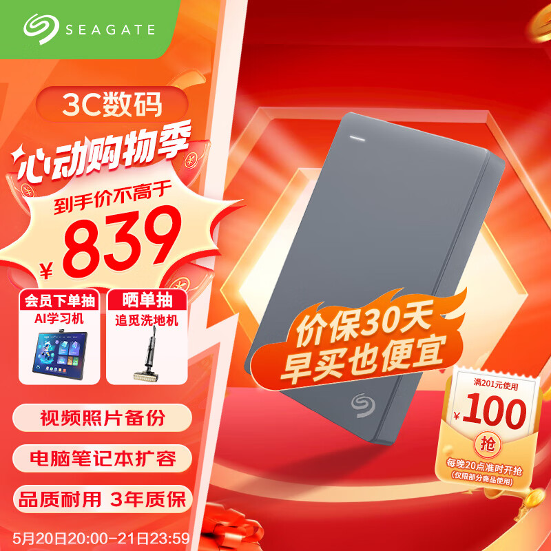 希捷(SEAGATE)移动硬盘 4TB 大容量 USB3.0 简 2.5英寸 机械硬盘 高速便携 兼容PS4 外接 存储备份价格:839.00元!